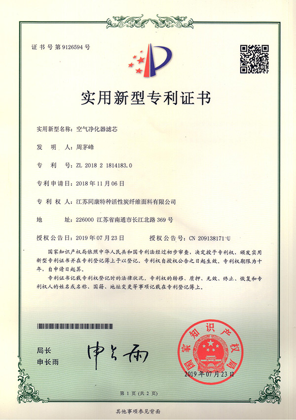 專利證書(shū)空氣凈化器濾芯